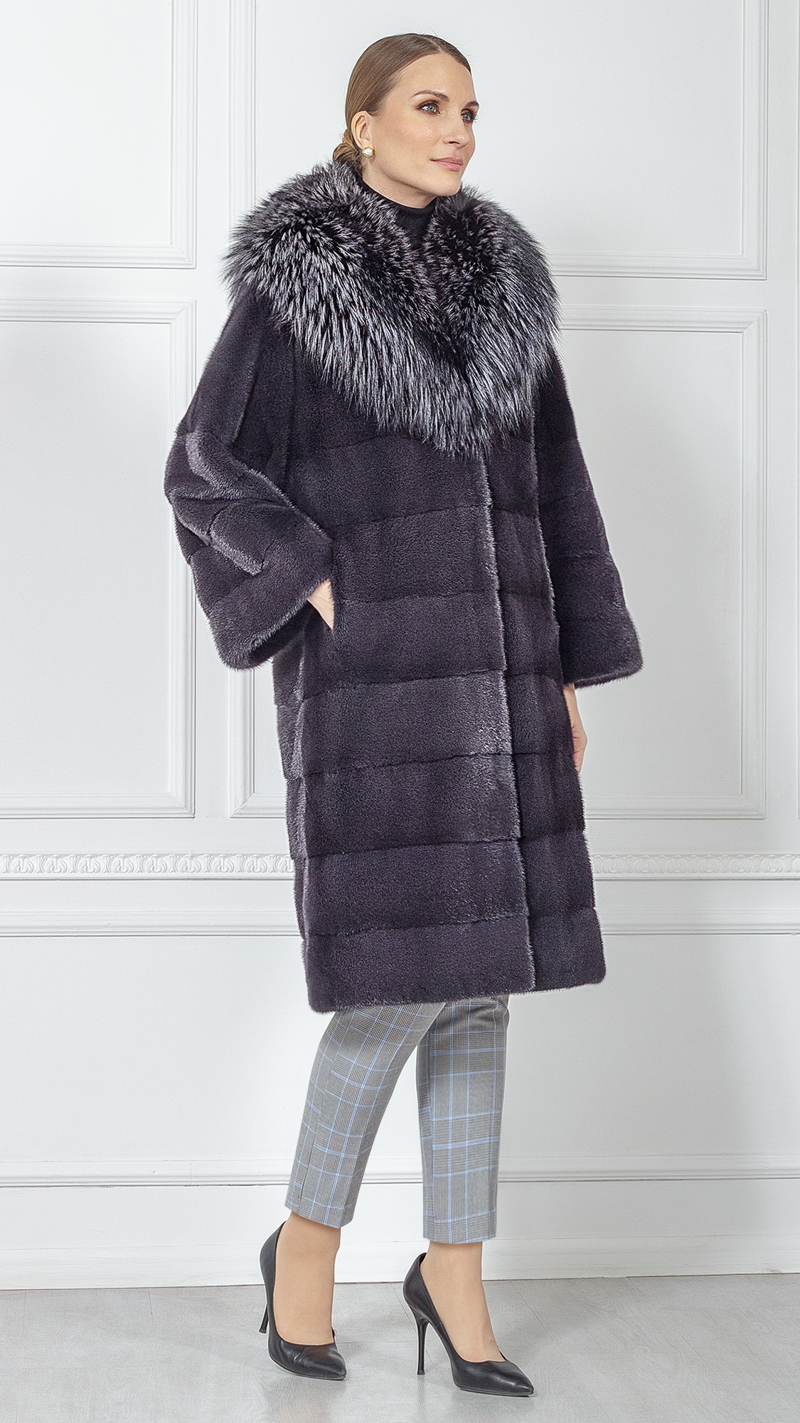 Шуба из меха норки, отделка чернобурая лиса